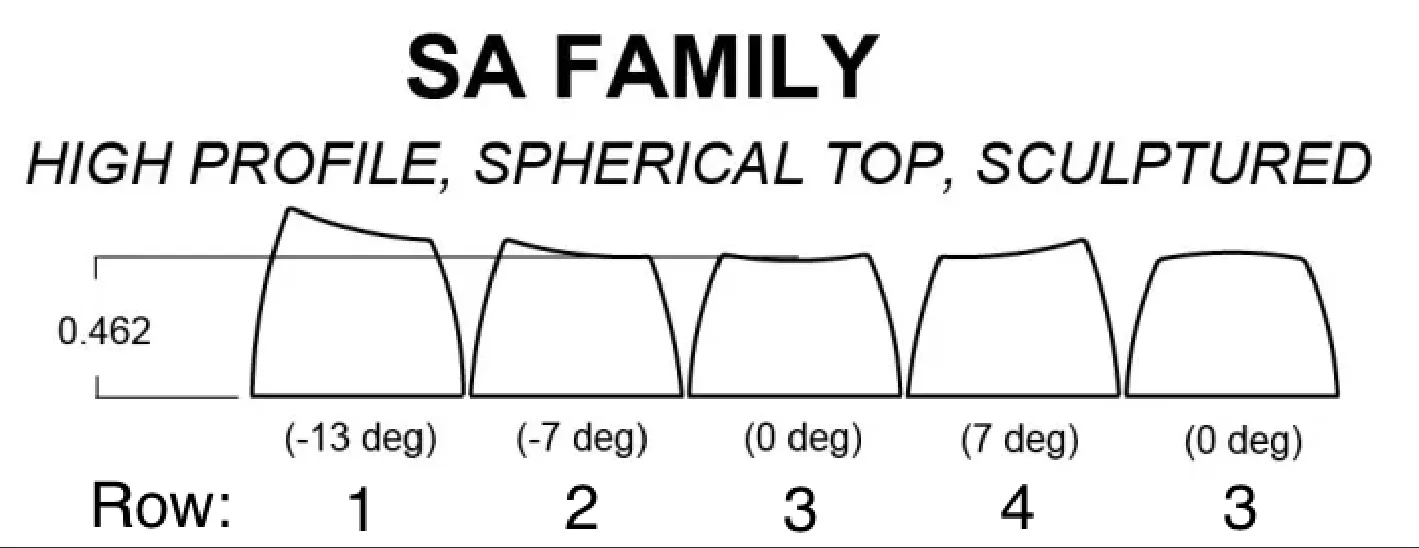 It can be used with any MX keycap profile, but is designed specifically for the ergonomic SA Keycap profile. The E0 has been designed to use off the shelf keycap sets. The layout leverages the variable height profile of SA keycaps.