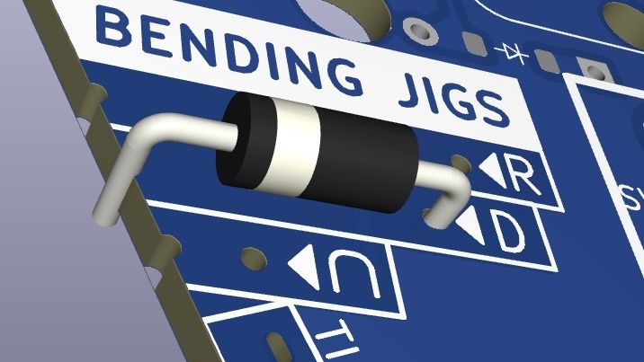 - Bend the legs of the 1N4001 Shottky diode using the bending jig on the left of the board.